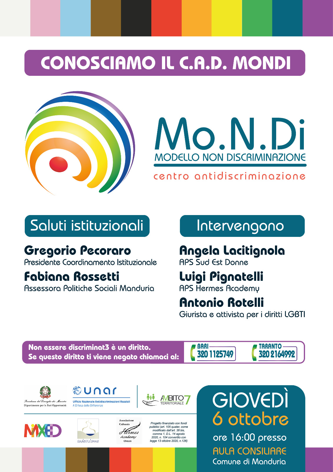Giovedì 6 ottobre sarà presentato, presso l’aula consiliare del Comune di Manduria, il progetto Mo.N.Di., il nuovo Centro antidiscriminazione finanziato dall’UNAR per contrastare discriminazioni e violenze sulle persone LGBTQI+