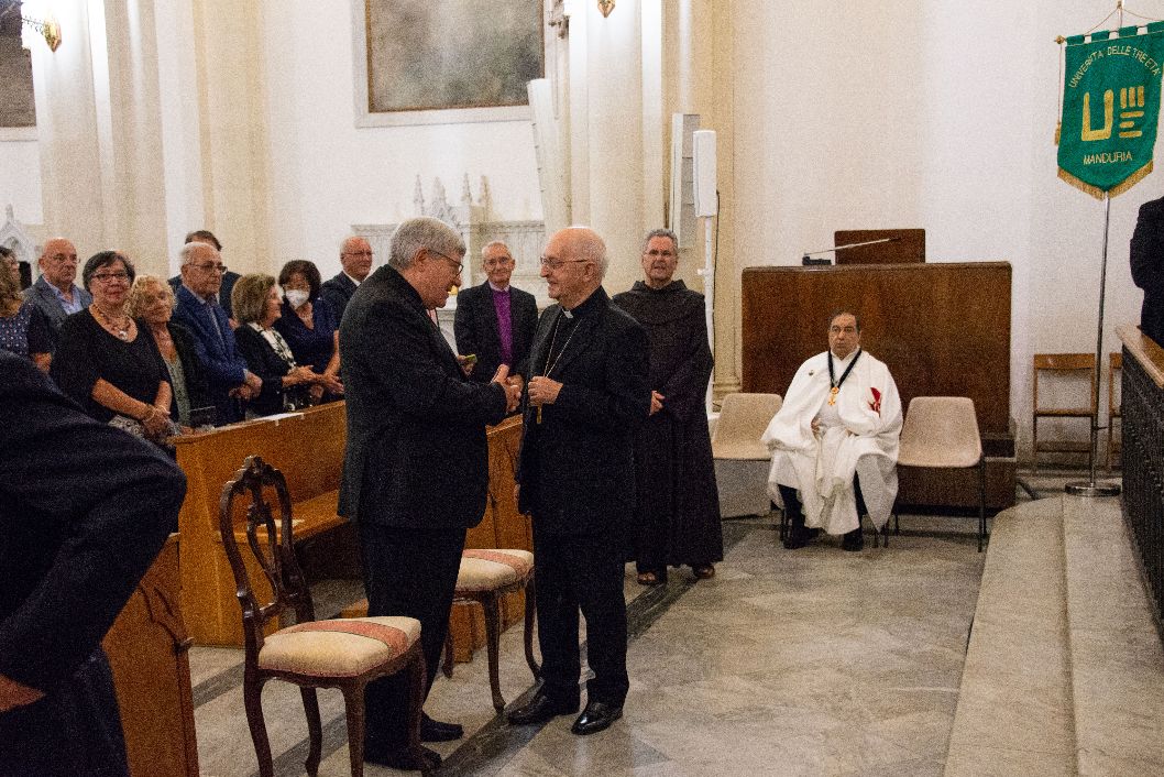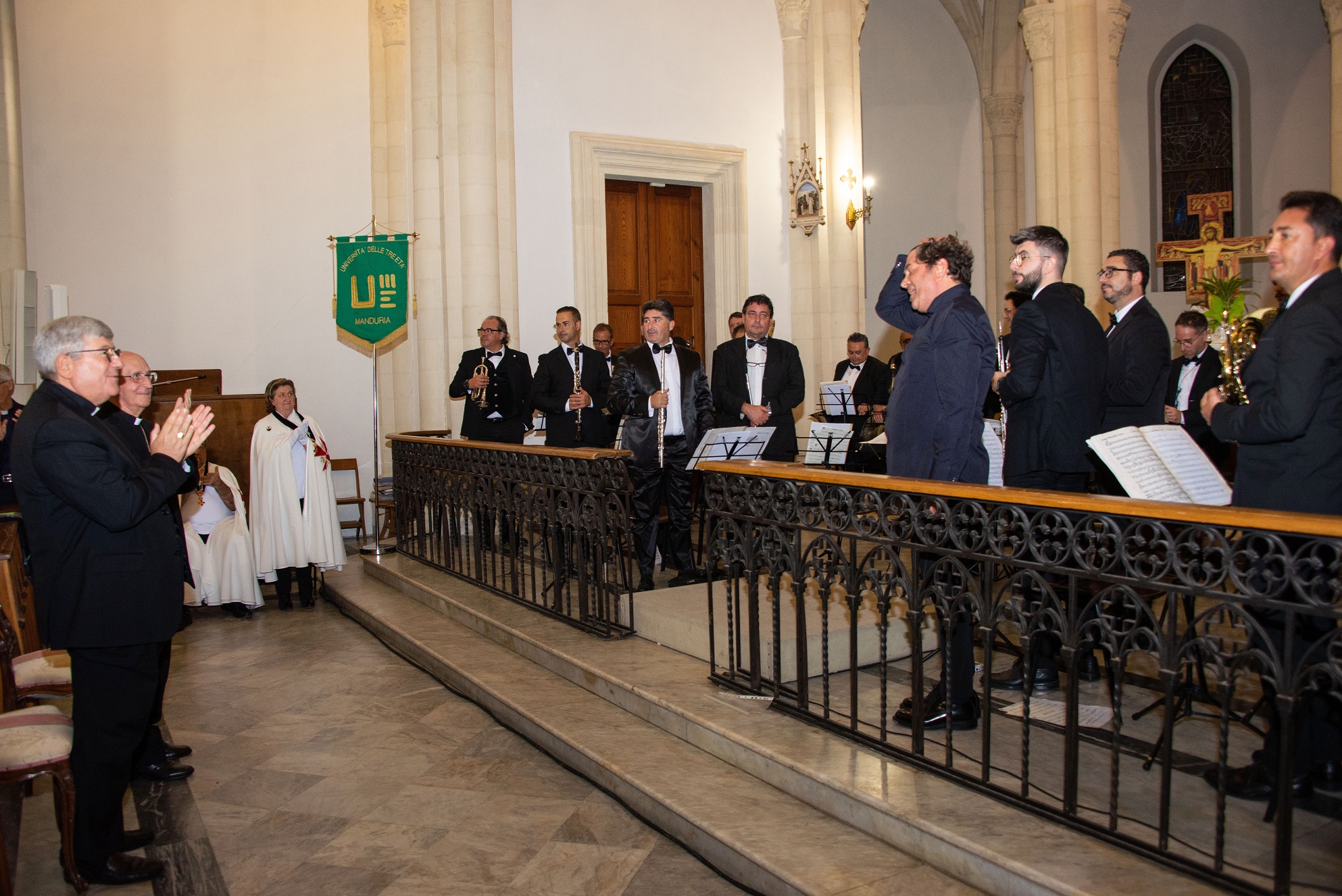 Manduriano tra i manduriani, uno dei più importanti esponenti della Chiesa Cattolica, si è concesso al folto pubblico che ha riempito la chiesa di Sant’Antonio da Padova. La serata, che ha messo a dura prova i componenti dell’associazione “W. Tommasino”, guidati dal presidente Gregorio Di Giacomo e dal direttore artistico Cosimo Antonio Ruggieri, ha offerto al cardinale Filoni una esibizione dell’orchestra di fiati “W. Tommasino'”, diretta dal maestro Antonio Errico Agnello, e la possibilità di raccontarsi con grande spontaneità.