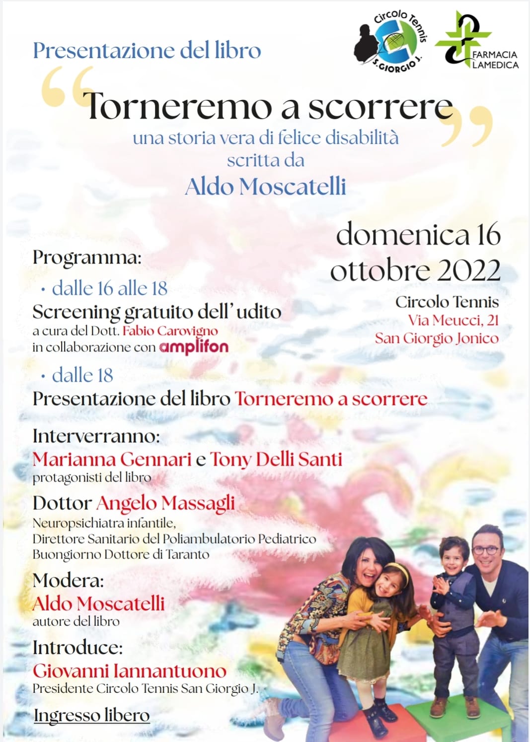 Sarà presentato domenica sera a San Giorgio Ionico, alle 18, presso il circolo tennis di via Meucci, il libro “Torneremo a scorrere”, di Aldo Moscatelli. Libro che un sottotitolo eloquente: una storia vera di felice disabilità.