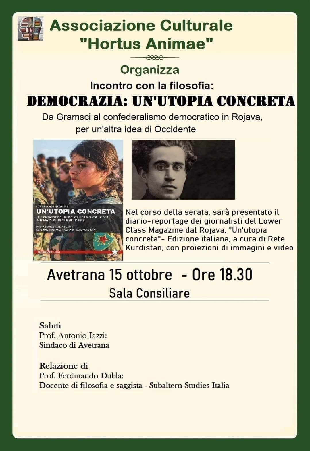 “Da Gramsci al con federalismo democratico in Rojava,per un’altra idea di Occidente”: questo il sottotitolo della serata che sarà aperta dai saluti del sindaco Antonio Iazzi.