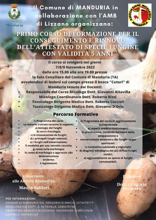 Il Comune di Manduria in collaborazione con l'AMB di Lizzano organizzano il primo corso di formazione per il conseguimento e rinnovo dell'attestato di specie fungine con validità 5 anni.