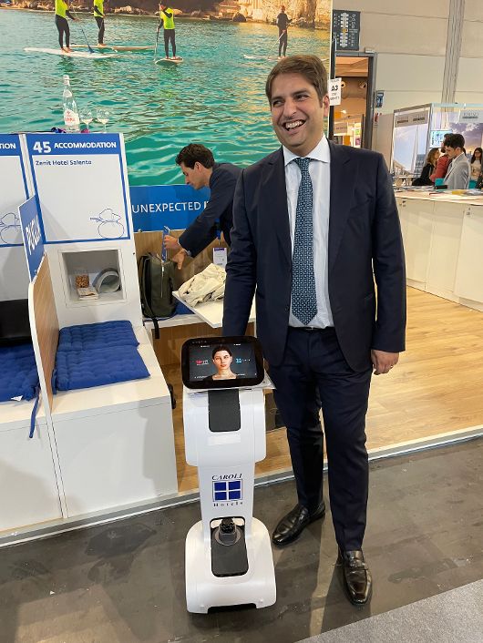 Il robot Carolinə (nella foto con l’assessore al Turismo della Regione Puglia Gianfranco Lopane), il robot concierge di Caroli Hotels, era presente al TTG Travel Experience a Rimini. L'esordio del robot ha consentito al gruppo alberghiero di acquisire i nominativi di clientela interessata a un soggiorno in Puglia con la relativa profilazione,