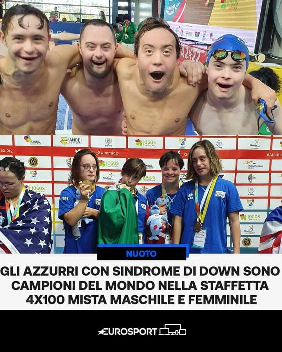 La nazionale italiana con sindrome di Down conquista i titoli mondiali nella staffetta 4X100 mista sia maschile che femminile (nelle foto).