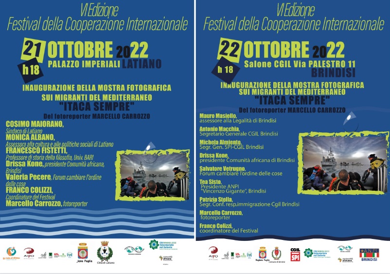 La mostra sarà presentata in due eventi che si svolgeranno, il 21 ottobre, alle ore 18, a Latiano, presso palazzo Imperiali e il 22 ottobre, alle ore 18, a Brindisi, presso la sede della Cgil, in via Palestro 11 (presso piazza Cairoli). Due eventi in cui si parlerà di migrazione e Mediterraneo con le Amministrazioni comunali di Latiano e Brindisi, la comunità africana, il forum “Cambiare l’ordine delle cose”, la CGIL Brindisi e SPI-CGIL Brindisi e l’ANPI.