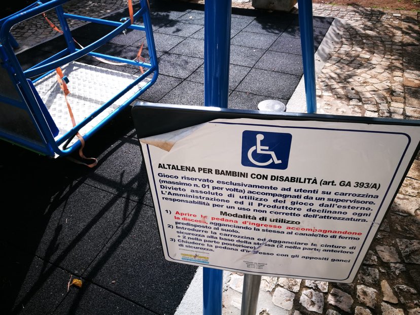 L’altro ieri avevamo dato notizia di una giostrina che, pur non essendo rotta, si era staccata dal pavimento. Gli operai del Comune l’avevano prelevata nei giorni a cavallo fra fine maggio e inizi di giugno e, ancora, non è stata rimontata, nonostante le tante promesse…