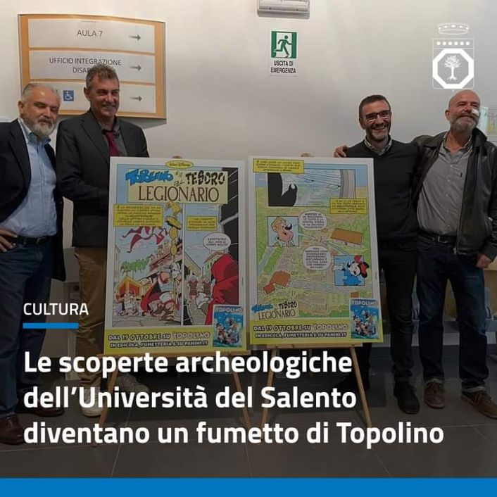 È ispirata alle ricerche archeologiche dell’Università del Salento ad Aquinum (Castrocielo, FR) la storia a fumetti “Topolino e il tesoro del legionario”, in edicola dal 19 ottobre su Topolino: si racconta la storia immaginaria del mistero del Corno di Topolomeo, arrivato nel sito di Aquinum nel 44 avanti Cristo, nascosto sul muso di un rinoceronte. Topolino e Gambadilegno, protagonisti dell’avventura, troveranno l’antico reperto e ci sarà anche il personaggio dell’archeologo ispirato al direttore scientifico degli scavi, il professor Giuseppe Ceraudo, docente a UniSalento di Topografia antica. Nel corso della storia, una rappresentazione fedele delle attuali tecniche di indagine in archeologia nel sito.