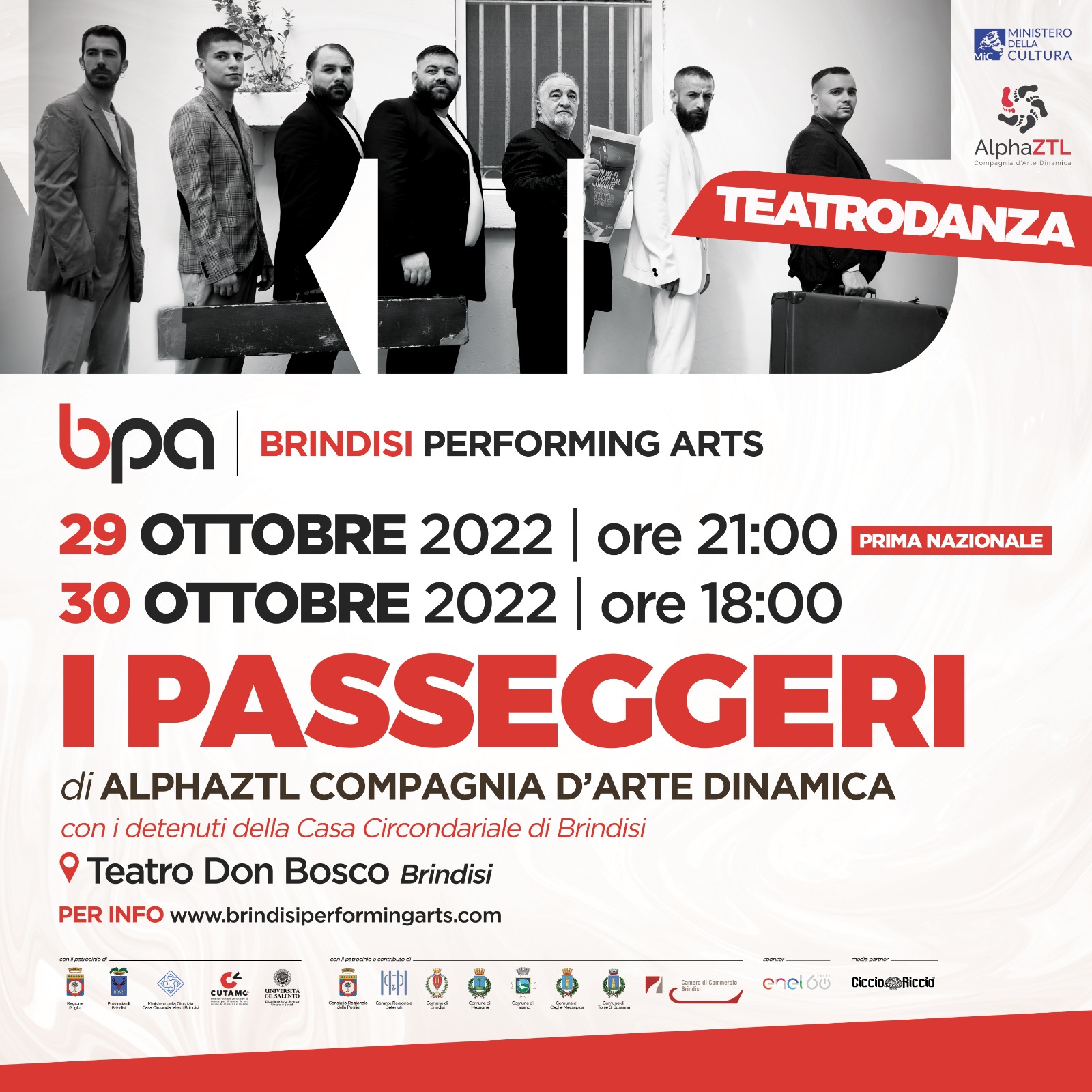 Sabato 29, ore 21, e domenica 30 ottobre, ore 18, teatro Don Bosco di Brindisi, sarà di scena un viaggio che darà la possibilità di andare oltre le apparenze con “I passeggeri”, spettacolo ideato e prodotto da Alpha ZTL Compagnia d’Arte Dinamica con la regia di Vito Alfarano, inserito nel cartellone del BPA, Brindisi PerformingArts.