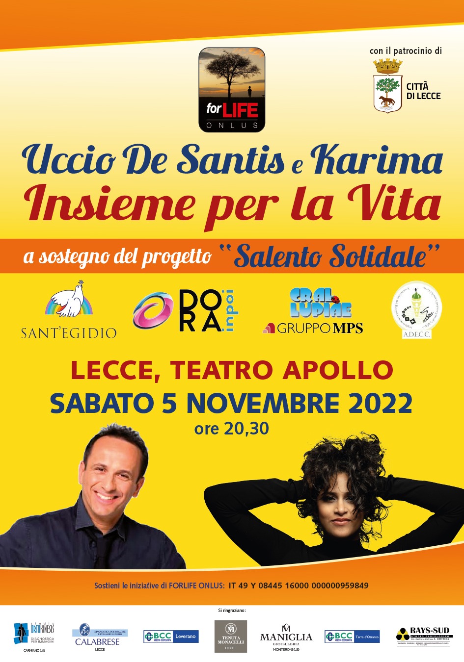 Insieme per la vita, l’atteso appuntamento di spettacolo e solidarietà, giunto alla sua XIII edizione, torna a Lecce al teatro Apollo. La gioia di ritrovare il pubblico incontra la generosità dei salentini in quello che ormai è diventato un appuntamento fisso. Un lavoro di attenzione e di iniziative rivolte al sociale targate Forlife che sono continuate anche in questi anni molto delicati e che il 5 novembre ritrovano la gioia della condivisione e l’abbraccio del pubblico. Al teatro Apollo si svolgerà “Insieme per la vita-Salento Solidale’. Direttamente da Mudù l’esilarante comicità di Uccio De Santis, Antonella Genga e Umberto Sardella e a seguire la perfomance della cantante Karima.