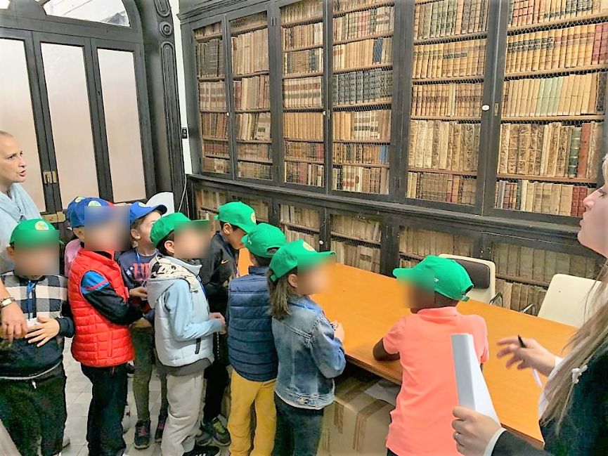 Per svolgere al meglio le attività previste, i venticinque allievi sono stati divisi in due gruppi, ognuno dei quali ha partecipato ad un interessante ‘bibliotour’ in compagnia dei ragazzi del Servizio Civile Nazionale di turno in biblioteca, Giulia, Matteo e Marcella, dei soci Archeoclub presenti e del signor Renato, dipendente comunale e responsabile della biblioteca. Cappellino colorato in testa, zainetto in spalla e tanto stupore nel cuore, i bambini hanno ‘passeggiato’ in biblioteca, ascoltando con interesse l’antica storia della biblioteca, dei suoi fondatori e di altri personaggi illustri di Manduria, i cui busti (del senatore Nicola Schiavoni, dello scrittore e poeta Giuseppe Gigli, del dottor Michele Greco, bibliotecario nella Gattiana per un trentennio) e ritratti (di Marco Gatti, di Maria Giulia Trojani, di Giuseppe Pacelli) arricchiscono di storia e di cultura le sale della Gattiana. Sono state inoltre illustrate loro le modalità di funzionamento di una biblioteca (ricerca di un libro negli antichi schedari oppure nei moderni computer, con il servizio Bibljorete), e l’utilizzo di antichi oggetti ivi presenti (ad esempio l’antica campana del 1625, scampata alla fusione nella Seconda Guerra Mondiale grazie all’interessamento del dottor Michele Greco).