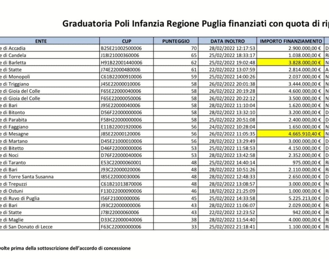 Torre Santa Susanna ha invece ricevuto un finanziamento di 2 milioni e 650mila euro.