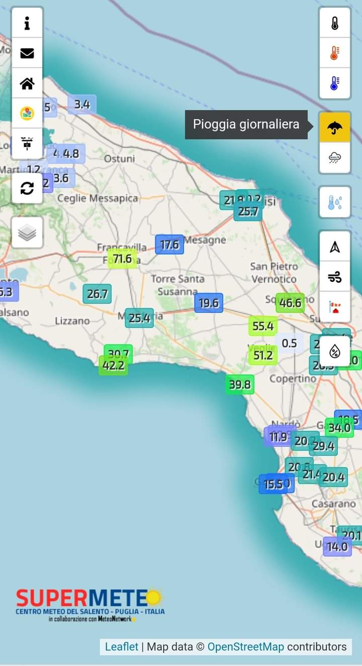 A Manduria si è registrato invece un accumulo di 25.4 mm. Marcata flessione della temperatura: -8 gradi rispetto a due giorni fa.