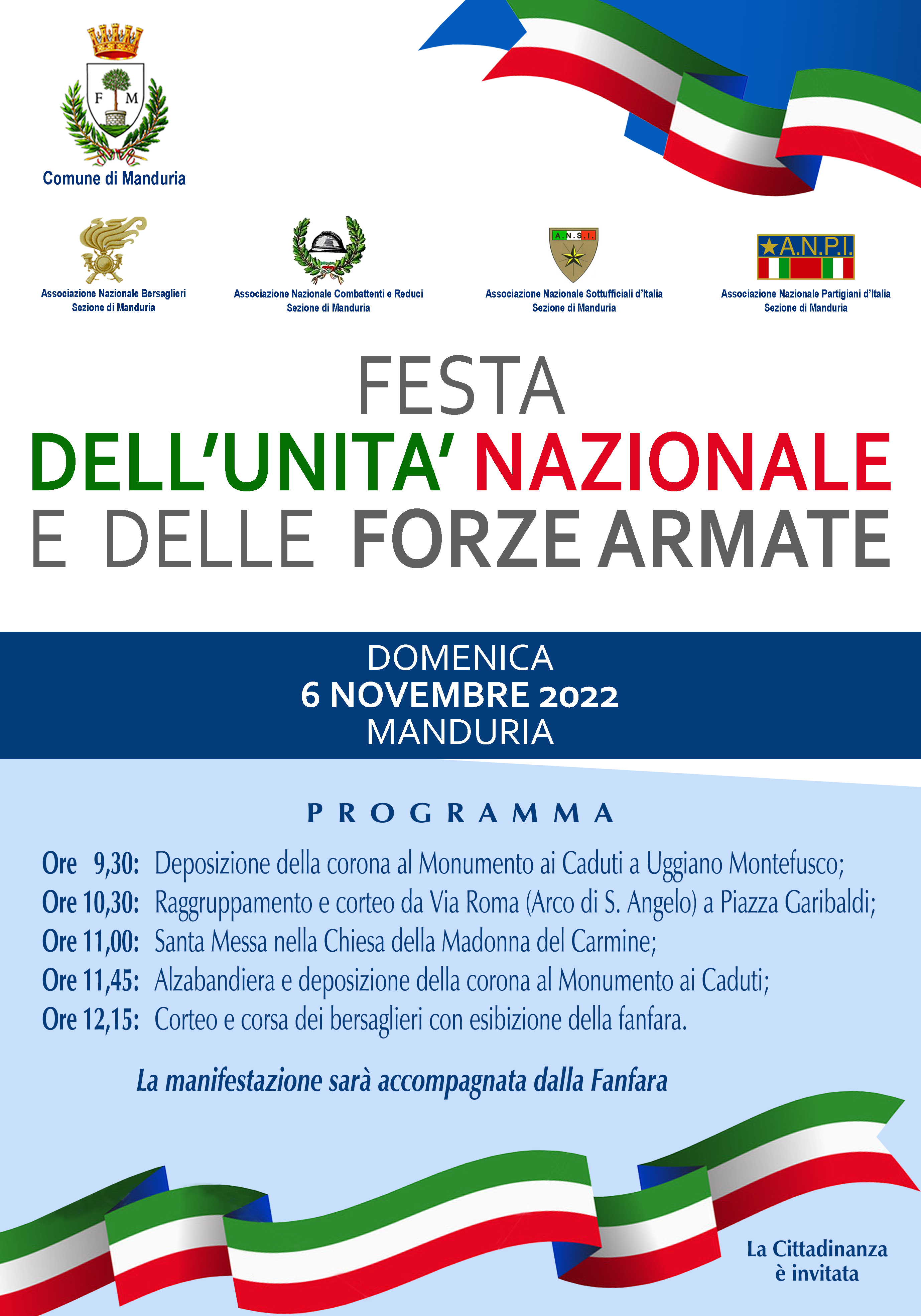 Ecco il programma delle iniziative promosse dal Comune di Manduria, dall’Associazione Nazionale Bersaglieri sezione di Manduria, dall’Associazione Nazionale Combattenti e Reduci sezione di Manduria, dall’Associazione Nazionale Sottufficiali d’Italia sezione di Manduria e dall’Associazione Nazionale Partigiani d’Italia sezione di Manduria