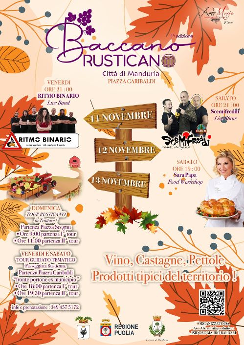 Dall’11 al 13 novembre (due serate e una mattinata), Manduria festeggerà con “Baccano Rusticano”, il suo San Martino, non un evento, ma l’evento realizzato per rappresentare valori,identità locali ed allo stesso tempo universali; l’evento in cui i sapori locali si intrecciano con le musiche, le tradizioni e le manualità con ospiti e confronti nella dimensione “Glocal”.
