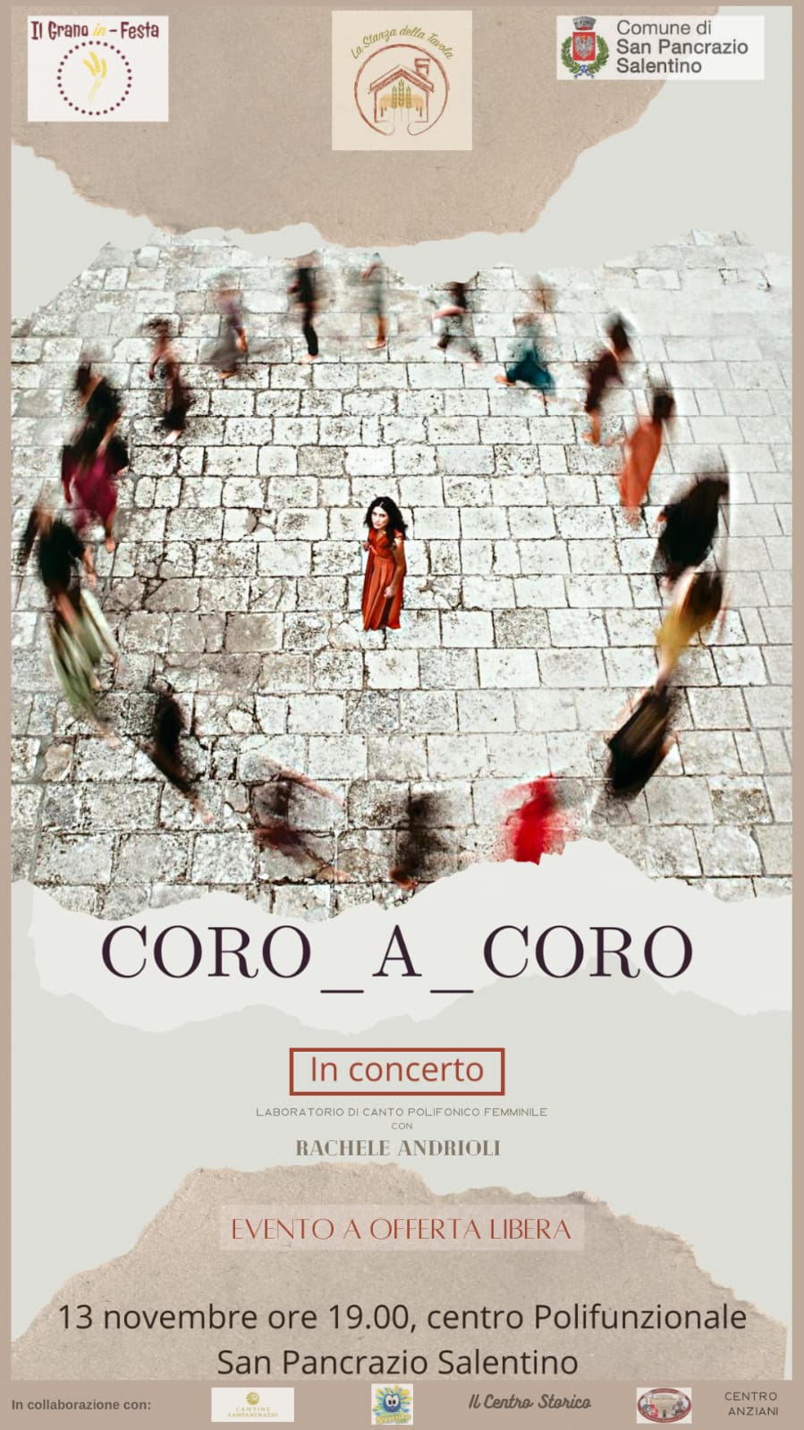 Coro a Coro, progetto di recupero e valorizzazione della musica popolare del mondo in chiave femminile, domenica 13 novembre, alle 19, farà tappa nel Centro Polifunzionale di San Pancrazio Salentino grazie all’impegno della dinamica associazione locale “Il Grano in-Festa” ed il patrocinio all’evento dell’Amministrazione comunale della città. Due ore di musica vera ed autentica per vivere «un laboratorio di canto d'insieme in continua evoluzione per donne che amano cantare musiche popolare di sperimentazione, scoprire il fascino della polifonia e la forza terapeutica del canto». Ideatrice del progetto è l’artista Rachele Andrioli che ha sapientemente miscelato tecniche innovative a partire dalla propria esperienza di viaggi, collaborazioni e incontri con altre culture fino a dare vita ad uno spettacolo in cui la tradizione pugliese incontra terre vicine e lontane.