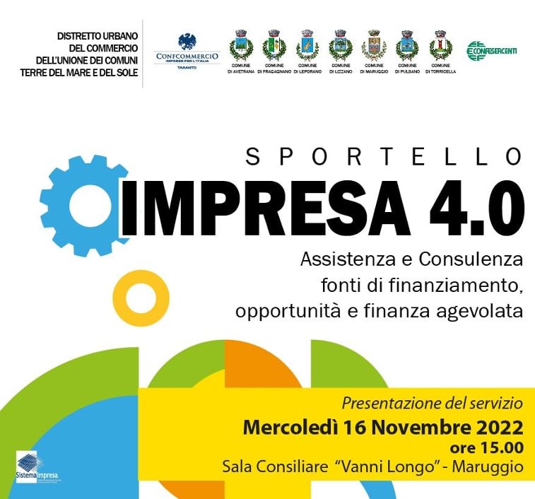 Ai nastri di partenza lo Sportello Impresa 4.0, rivolto alle imprese del commercio, turismo e servizi del Distretto Urbano del Commercio dell’Unione dei Comuni delle ‘Terre del Mare e del Sole’ (Avetrana, Fragagnano, Leporano, Lizzano, Maruggio, Pulsano, Torricella).