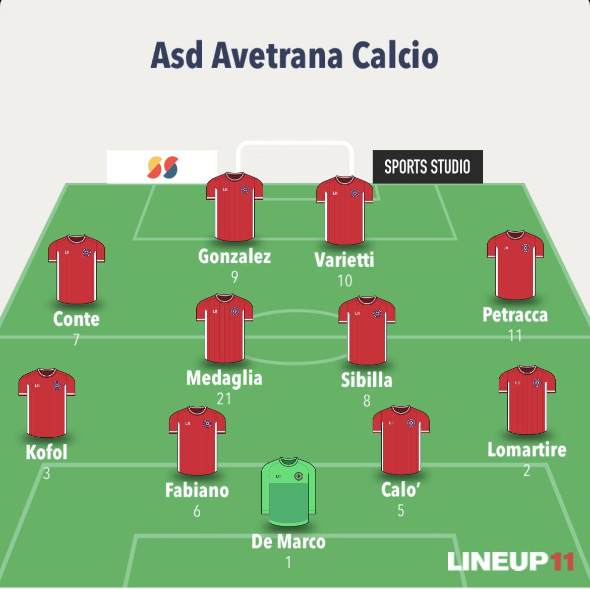 AVETRANA: De Marco, Lomartire, Kofol; Medaglia, Calò, Fabiano; Conte (s.t. 16’ Zaccaria), Sibilla, Gonzalez, Varietti (s.t. 37’ Sanyang), Petracca (s.t. 42’ Altavilla). A disp De Oliveira, Dell’Atti, Massaro, Fiorini, Lombardi, Trisciuzzi. All.: Franco .