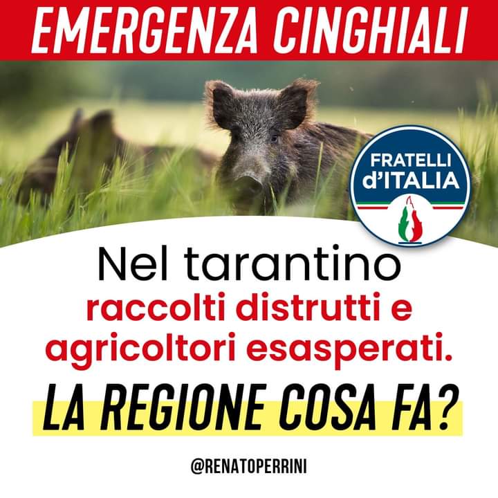 «L’emergenza cinghiali è diventata per gli agricoltori tarantini insopportabile. Nei giorni scorsi ho raccolto il grido di allarme e di disperazione di molti contadini di Laterza, Castellaneta e Ginosa che oltre a lamentare ingiusti tributi dovuti ai Consorzi senza ricevere nessun servizio in cambio, oltre che imprecare per le grandinate e bombe d’acqua che non risparmiano la nostra regione, sono costretti ad arrivare la mattina nelle loro campagne e trovarle devastate dai cinghiali che fanno razzia dei prodotti agricoli, ma distruggono per sempre le piante. Senza contare che la loro presenza costituisce anche un pericolo per la sicurezza, soprattutto stradale, nelle strade di campagna stanno aumentando gli incidenti alcuni anche con gravi conseguenze.