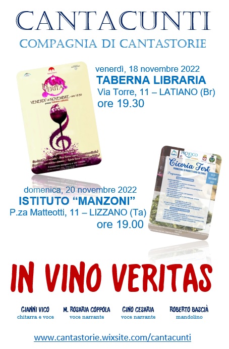 È questo “In vino veritas”, la performance che i Cantacunti metteranno in scena oggi e domenica per festeggiare il vino novello. Due appuntamenti (venerdì, 18 presso la Taberna Libraria di Latiano alle 19.30 e domenica, 20 presso l’istituto “Manzoni” di Lizzano alle 19) per celebrare in musica il risultato della vendemmia, che vedrà sul palco Gianni Vico (chitarra e voce), Maria Rosaria Coppola (voce narrante), Gino Cesaria (voce narrante) e Roberto Bascià (mandolino).