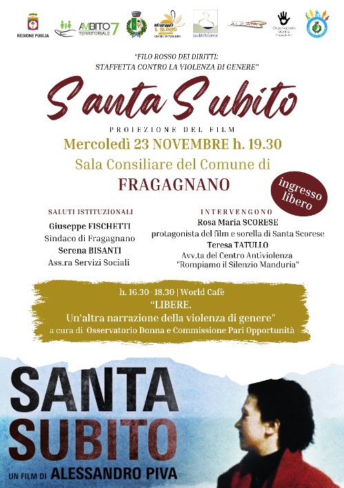 Il 16 marzo del 1991 moriva, uccisa da uno stalker con 14 coltellate, Santa Scorese, una ragazza pugliese di 23 anni considerata la prima vittima di stalking e femminicidio in Italia.A pochi giorni dal 25 novembre, Giornata Internazionale per l’eliminazione della violenza sulle donne, il Centro Antiviolenza Rompiamo il Silenzio Manduria, in collaborazione con l’Ambito Territoriale di Manduria e il Comune di Fragagnano, propone la visione del docufilm di Alessandro Piva “Santa Subito”,prodotto da Apulia Film Commission e Fondazione Con il Sud.
