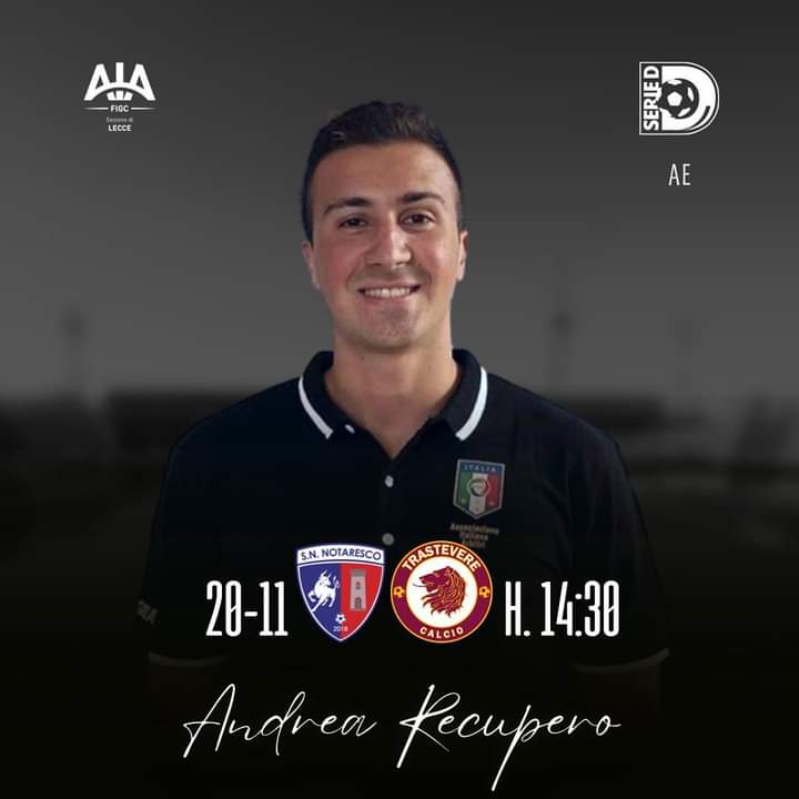 L’arbitro Andrea Recupero (sezione AIA di Lecce) dirigerà oggi l’incontro Notaresco-Trastevere, inserito nel programma della 12ª giornata del girone F della serie D.