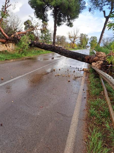Sulla SP 112, in prossimità del villaggio Resta a Nardò, un albero di pino di almeno 12 metri è caduto a causa di una tempesta con forti raffiche vento, occupando completamente di traverso la carreggiata di transito sulla carreggiata, danneggiando da una parte il guardrail e dall’altra il muro di cinta di una villa senza per fortuna causare danni alle persone o alle auto che in quel momento transitavano.