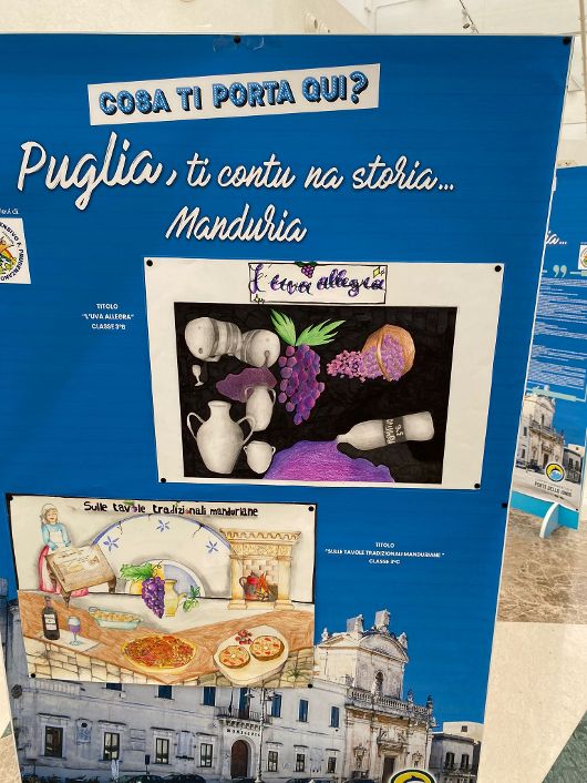Gli studenti delle classi seconde e terze della scuola secondaria di primo grado, dopo aver identificato, insieme alle loro docenti di Lettere e Arte, le principali tradizioni storico-culturali di Manduria e i monumenti che caratterizzano la città (la processione arborea di San Pietro, la fiera Pessima, il Fonte Pliniano, i giochi antichi, il digiuno dell’Immacolata, i piatti tipici e il vino Primitivo) hanno realizzato un disegno per classe utilizzando tecniche espressive diverse e un componimento collettivo in prosa o in poesia, alcuni di questi anche in vernacolo.