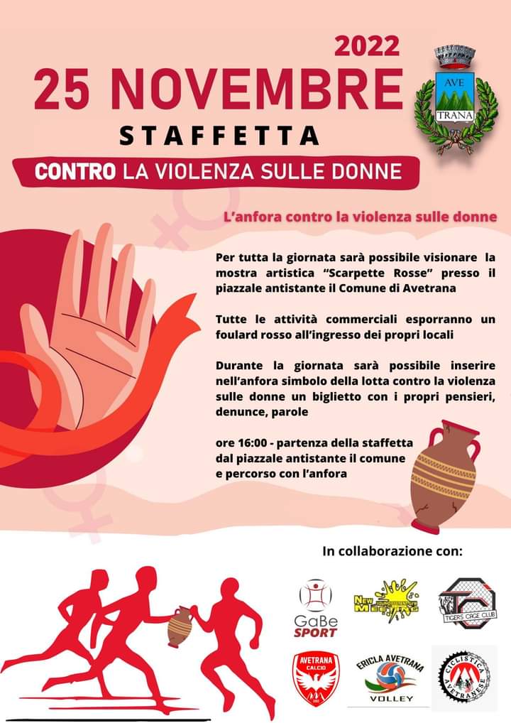 «In occasione della Giornata Internazionale Contro la Violenza sulle Donne, che ricorre ogni anno il 25 novembre, l’Amministrazione comunale di Avetrana, con la preziosa collaborazione delle associazioni sportive del territorio, organizza la “Staffetta contro la violenza sulle donne” volta a sensibilizzare i cittadini, di supporto a tale battaglia di civiltà.