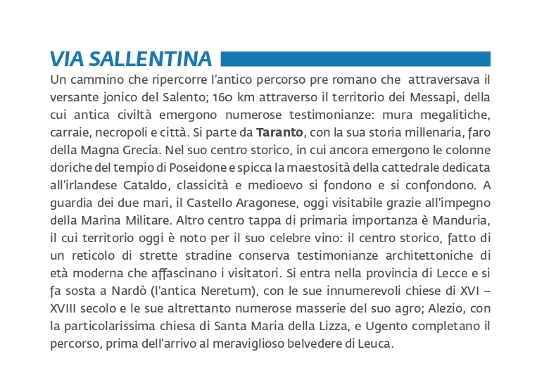Un cammino che ripercorre l’antico percorso pre romano che attraversava il versante jonico del Salento; 160 km attraverso il territorio dei Messapi, della cui antica civiltà emergono numerose testimonianze: mura megalitiche, carraie, necropoli e città.