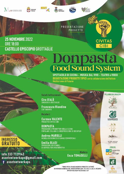 In seguito interverranno Carmen Valente che presenterà il progetto “Civitas Cibi”, la imprenditrice agricola Emilia Blasi che relazionerà su produzioni sostenibili di agricoltura rigenerativa, il consulente di sviluppo strategico Andrea Marulli che illustrerà modelli di business e di canali commerciali e, infine, Donpasta che relazionerà su produzioni e produttori della cucina popolare italiana e proietterà docufilm.
