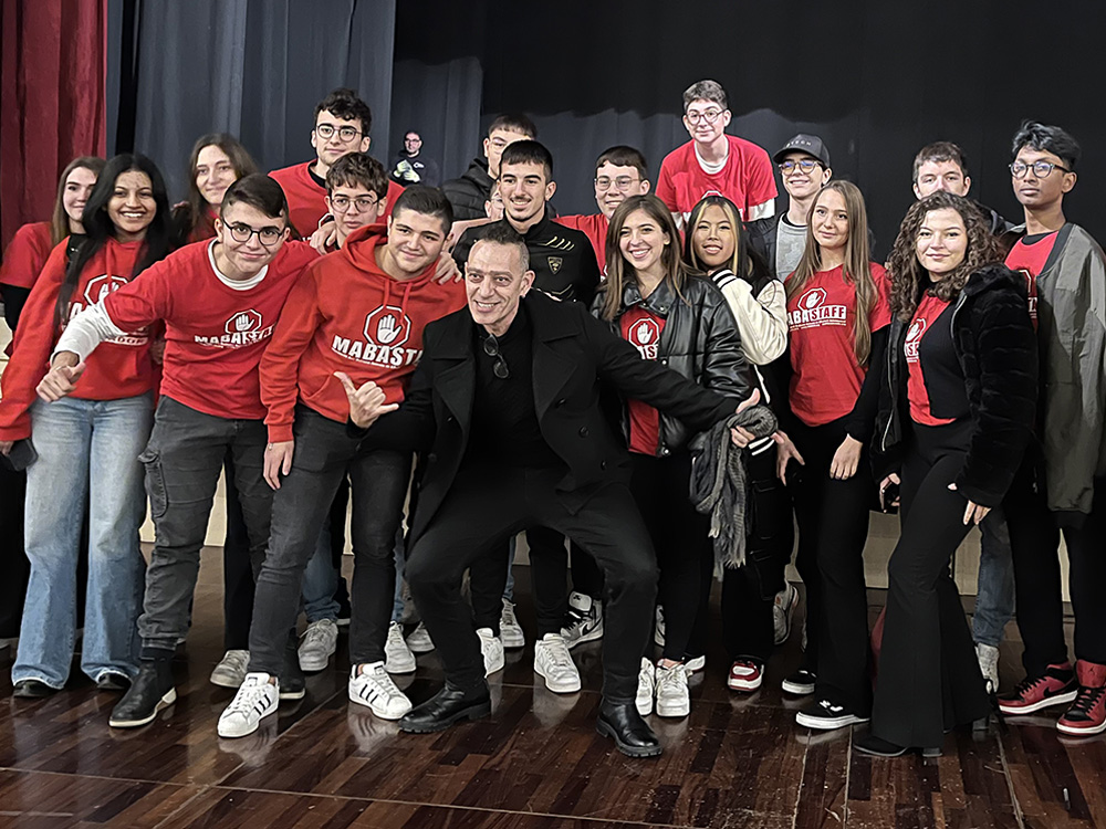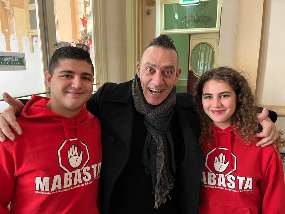 In questa importantissima prima, a sostenere lo spettacolo e ad essere accanto agli attori Francesca Trianni e Damiano Venuto, alla regista e direttrice artistica Liliana Putino e, soprattutto, ai 28 ragazzi di Mabasta (studenti del “Galilei-Costa” di Lecce) e al loro team leader Mirko Cazzato, c’è stato il poliedrico artista e musicista Nandu Popu dei Sud Sound System, il quale, a fine spettacolo è salito sul palco e, oltre a complimentarsi con tutti per la grande qualità dell’opera e per il modo in cui gli attori sono riusciti a trasmettere il messaggio focale e a far commuovere l’intera platea, ha spiegato ai ragazzi come anche la musica, molto presente anche nello spettacolo (musiche originali di Giacomo Sances), possa essere uno strumento valido per combattere il bullismo.