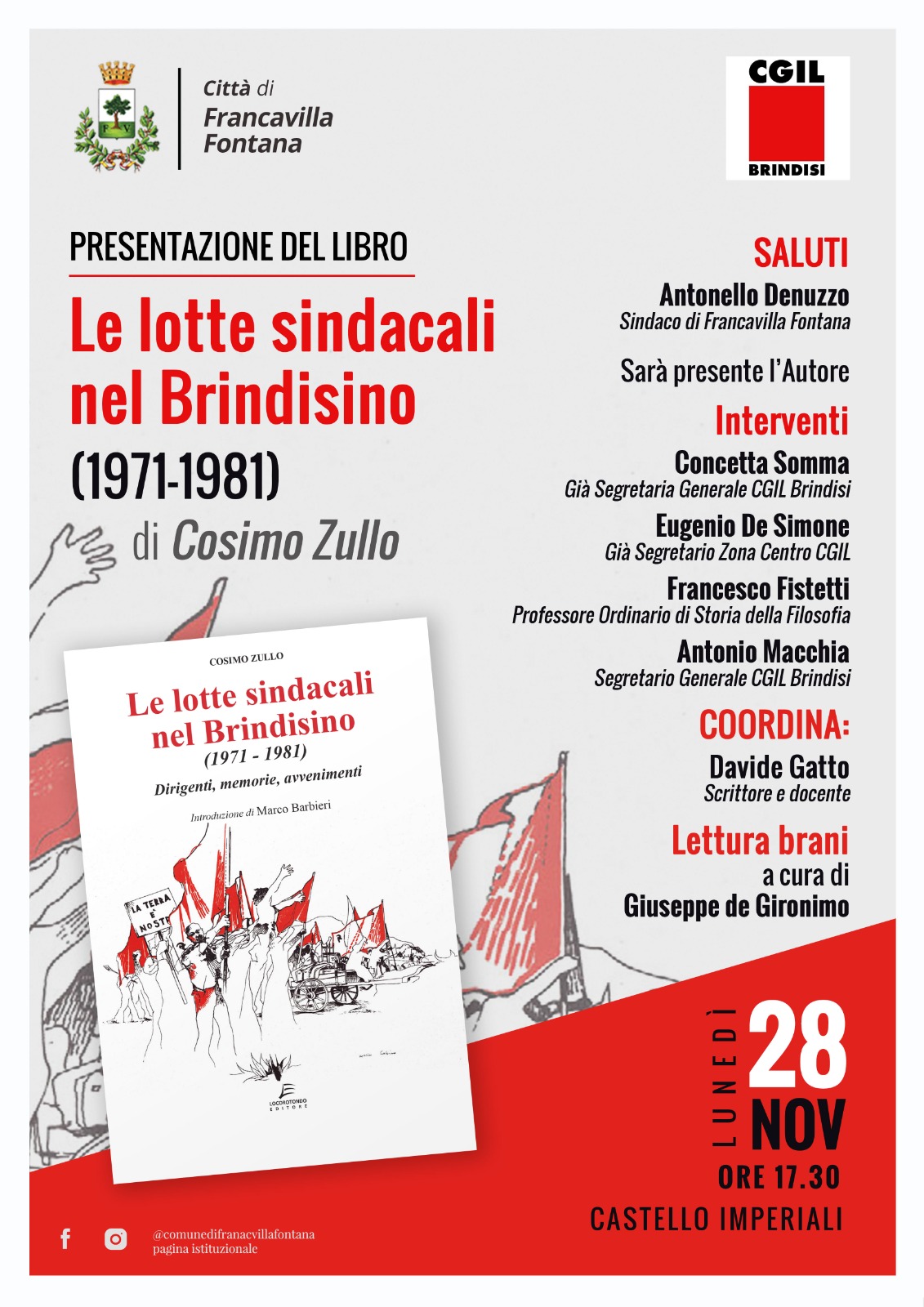 Lunedì 28 novembre, alle 17.30, a castello Imperiali è in programma la presentazione del libro di Cosimo Zullo “Le lotte sindacali nel Brindisino (1971-1981)”.