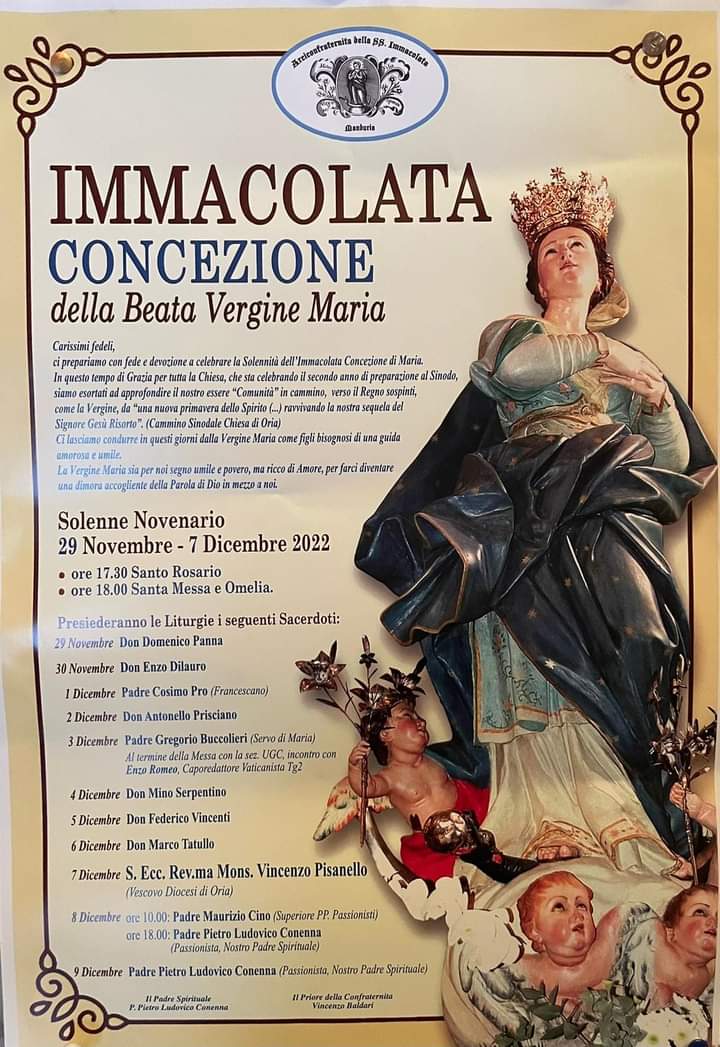 Predisposto e reso pubblico il programma delle celebrazioni religiose in onore della Immacolata Concezione della Beata Vergine Maria dell’Arciconfraternita dell’Immacolata. Programma che reca le firme del padre spirituale della confraternita, padre Pietro Ludovico Conenna, e del priore della Confraternita Vincenzo Baldari.