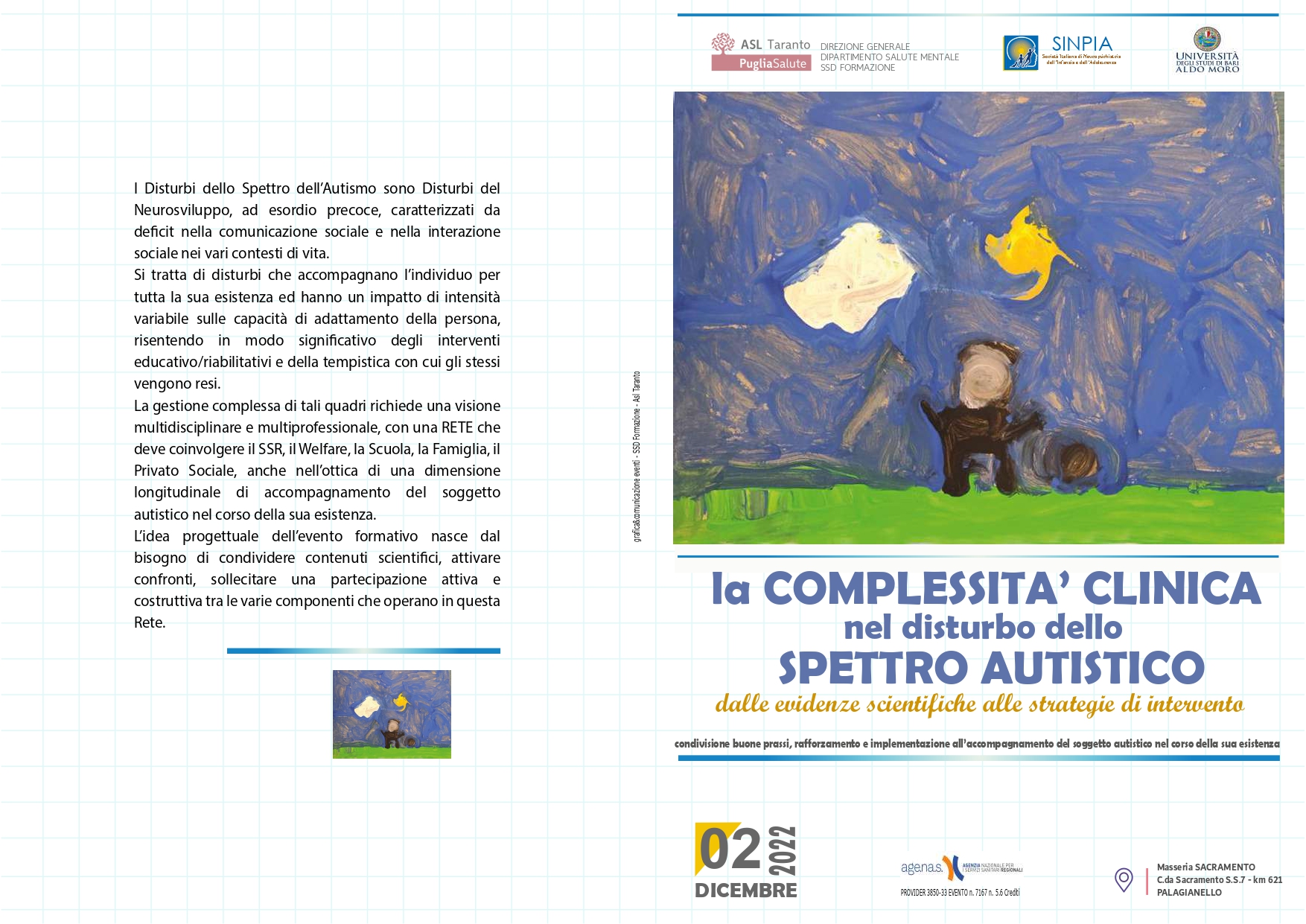 La giornata, dal titolo “La complessità clinica del disturbo dello spettro autistico”, organizzata da Asl Taranto e l’Università degli studi di Bari, insieme alla Società italiana di neuropsichiatria dell’infanzia e dell’adolescenza SINPIA, vuole essere una occasione di confronto sul tema dell’autismo tracciando un percorso dalle evidenze scientifiche fino alle strategie di intervento.