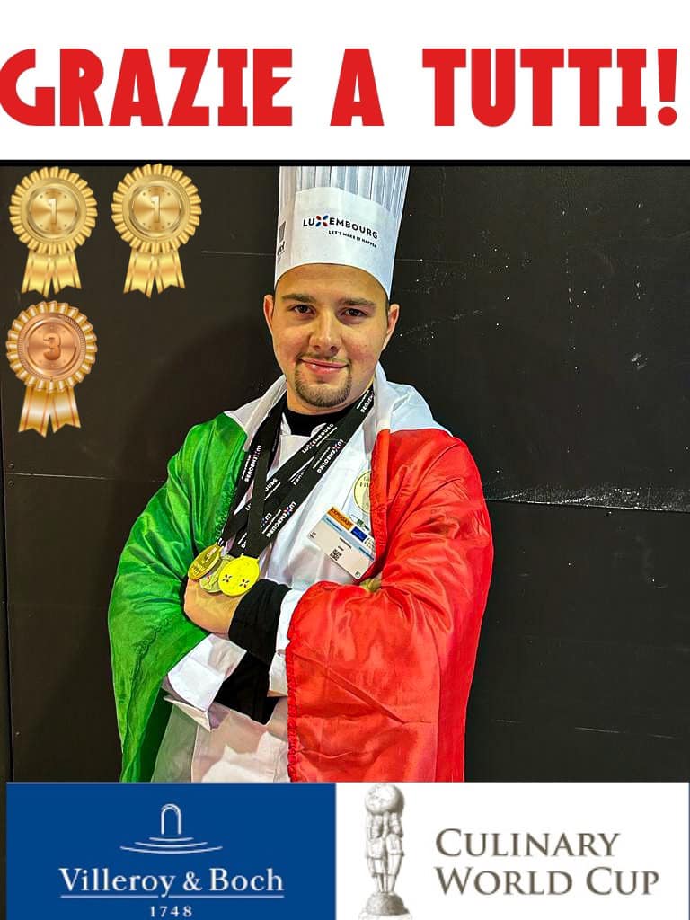 «Finisce così la mia esperienza nel Culinary World Cup 2022» le considerazioni di Giuseppe Guida al rientro a casa. «Torniamo a casa con 2 ori e un bronzo. Dietro a queste semplici medaglie c’è il cuore di un ragazzo che non ha mai smesso di sognare! Ho lavorato ininterrottamente giorno e notte pur di poter dimostrare qualcosa nella competizione culinaria più importante del mondo.