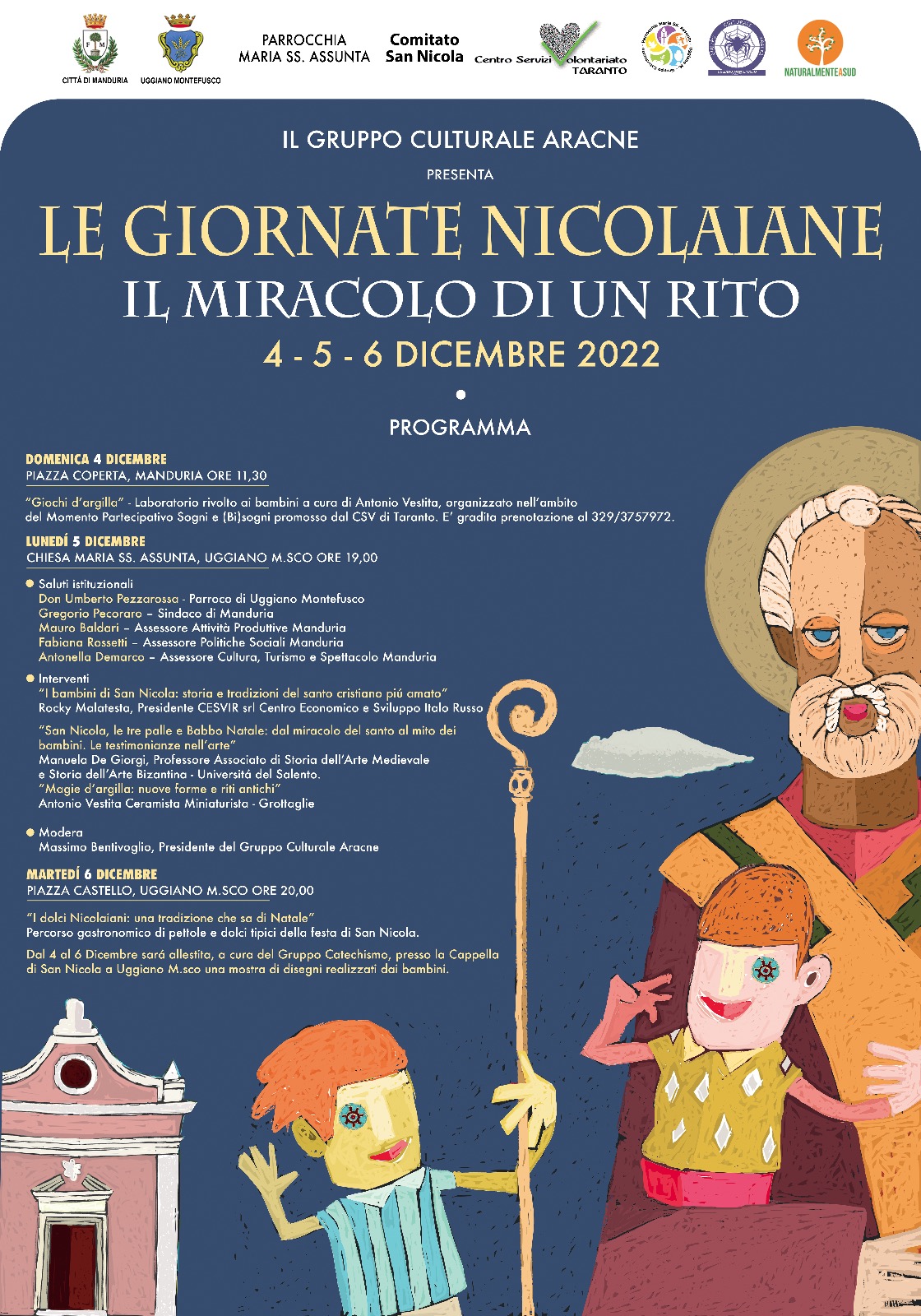 Le Giornate iniziano il 4 dicembre a Manduria in piazza Coperta, con il laboratorio “Giochi d’argilla”, rivolto ai bambini e curatoda Antonio Vestita, famoso ceramista, organizzato nell’ambito del Momento Partecipativo Sogni e (Bi)sogni promosso dal CSV di Taranto.I bambini, guidati da Vestita, realizzeranno i loro addobbi natalizi, ricordando che San Nicola è il vero Babbo Natale. Dal biscotto di ceramica (com’è detto, nell'arte della ceramica, l'oggetto dopo la prima cottura) si passerà al biscotto di farina, limone e cannella. Ai piccoli partecipanti, infatti, sarà donato il Biscotto di San Nicola, ideato e realizzato per l’occasione da Fabiano Comes, pasticcere di Manduria.