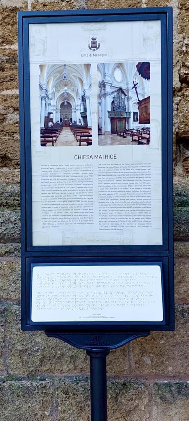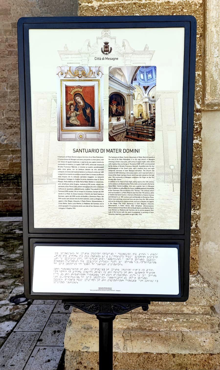 Le foto dei monumenti cittadini presso cui sono stati collocati – abbiamo cominciato con i primi dodici, tutti i monumenti di Mesagne ne avranno uno entro il prossimo anno - si accompagnano ai nuovi testi in italiano e inglese, elaborati e offerti gratuitamente all’Amministrazione comunale dall’Istituto culturale “Storia e Territorio” di Mesagne”. Una sezione del pannello riporta anche con scrittura Braille la didascalia esplicativa, consentendo la lettura anche a chi non può farlo con gli occhi perché ipovedente o non vedente.