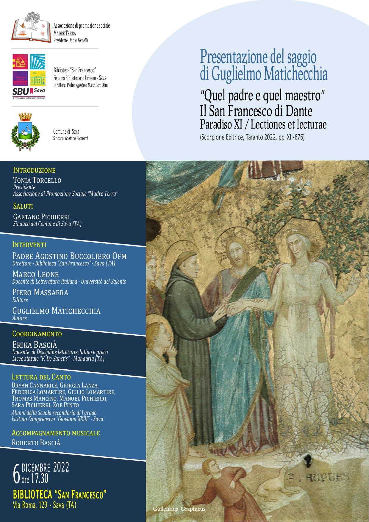 Martedì 6 dicembre, nella sede della biblioteca “San Francesco” di Sava, sarà presentato il volume di Guglielmo Matichecchia, «‘Quel padre e quel maestro’. Il san Francesco di Dante. Lectiones et lecturae dell’XI del Paradiso», edito dalla Scorpione Editrice di Taranto.