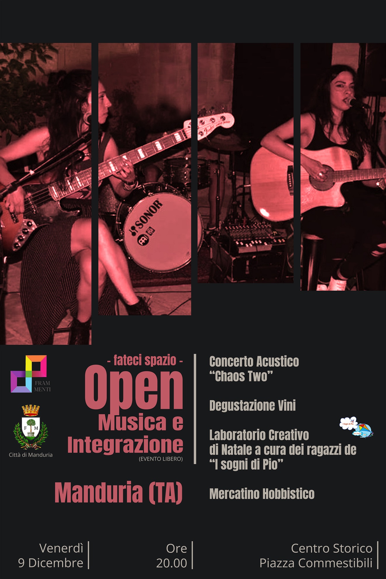 Il 9 dicembre, a partire dalle ore 19, il centro storico di Manduria è “spazio che ci unisce” per l’iniziativa natalizia “Open fateci spazio!”, inserita nel calendario degli eventi natalizi del Comune di Manduria con soggetto proponente l’associazione Frammenti.