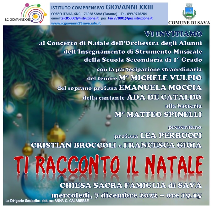 Sarà un momento emozionante sin dalle prime note la performance di questa sera a Sava, che, dopo i due anni forzati di stop a causa della pandemia, alza nuovamente il sipario sulle musiche natalizie, in un concerto dal titolo “Ti racconto il Natale”, a cura dell’orchestra degli alunni della scuola secondaria di 1° grado dell’istituto comprensivo Giovanni XXIII di Sava, diretta da Anna C. Calabrese, una realtà consolidata nell’ambito dell’insegnamento di strumento musicale, che l’istituto savese vanta da ben 35 anni, uno dei pochi in Italia.