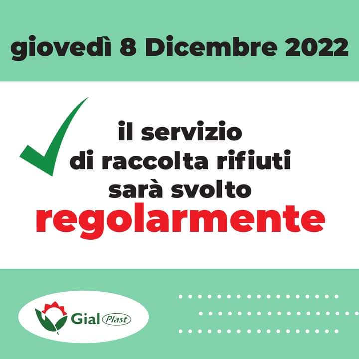 Si avvisa la cittadinanza che giovedì 8 dicembre il ritiro dei rifiuti avverrà regolarmente come da calendario.