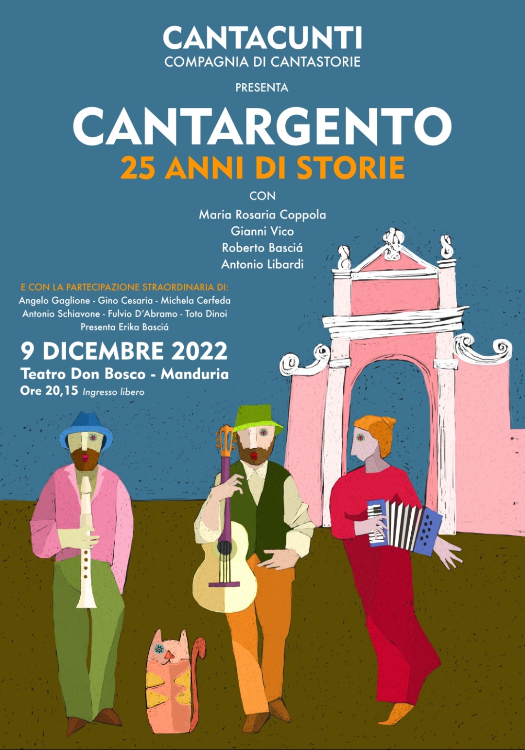 25 anni in cui i Cantacunti, Compagnia di Cantastorie ha raccontato in musica, nel pieno stile cantastoriale che li ha sempre contraddistinti, storie, aneddoti, vizi e virtù di una terra a volte aspra, a volte madre, ma sempre accogliente. È grazie a loro se storie come la presa di Otranto del 1480, del sindacalista Giuseppe Di Vittorio, di Nardella Mingolla, strega di Latiano o dell’ultima compagnia di burattini di Manduria tornano in auge nei loro concerti, “cantastoriate” dalla chitarra e voce di Gianni Vico, dalla voce narrante di Maria Rosaria Coppola, dalla chitarra e dal mandolino di Roberto Bascià e dal flauto di Antonio Libardi.