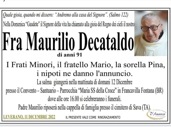 «Nato a Sava il 29 maggio 1931, vestì l'abito religioso il 15 agosto 1947, emise la Professione temporanea il 16 agosto 1948 e la Professione solenne il il 17 settembre 1952» è riportato nell’annuncio dei Frati Minori. «Fu ordinato Presbitero il 5 marzo 1955. Si laureò in Lettere e Filosofia presso l’Università Cattolica del Sacro Cuore a Milano e ricoprì diversi incarichi in vari conventi della Provincia. Fu Definitore provinciale, Guardiano Prefetto di formazione e Moderatore della Formazione Permanente. Come insegnante di Italiano, Latino e Greco, ha formato con competenza e rigore numerose generazioni di liceali nei lunghi anni di insegnamento. Anche nell’ultimo periodo della sua vita fra Maurilio ha sempre improntato le relazioni sulla cortesia e la fraterna delicatezza.