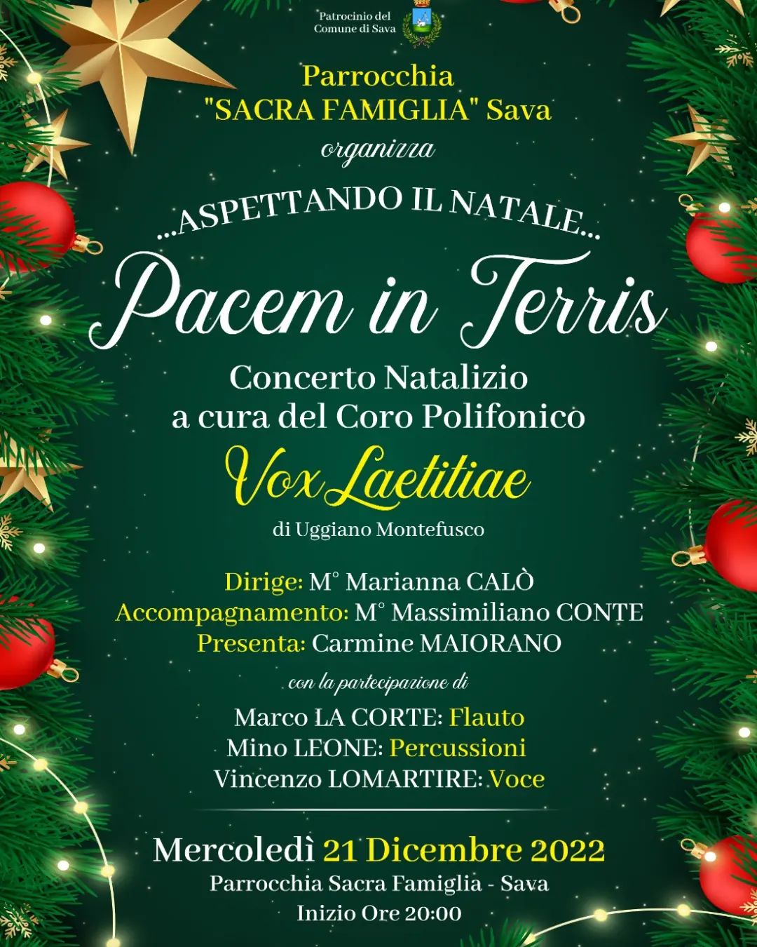 Mercoledì 21 dicembre, alle ore 20, nei locali della parrocchia Sacra Famiglia di Sava, il coro polifonico di Uggiano Montefusco “Vox Laetitiae”, diretto dalla maestra Marianna Calò, proporrà il concerto natalizio “Pacem in Terris”.