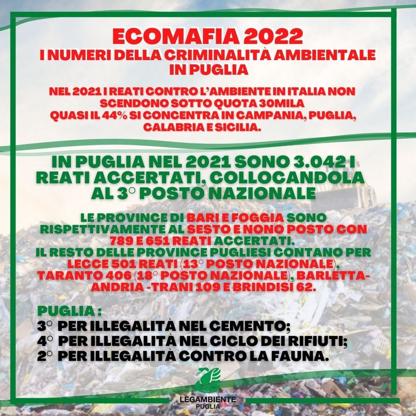 Nel rapporto 2022 dell’illegalità ambientale, la Puglia si colloca tra le prime regioni in termini di reati commessi, occupando il terzo posto con 3.042 reati accertat1 (il 9,9% sul totale nazionale), 984 sequestri effettuati, 2.714 persone denunciate e 62 arrestate. In quella nazionale le province di Bari e Foggia sono rispettivamente al sesto e nono posto con 789 e 651 reati accertati. Il resto delle province pugliesi contano per Lecce 501 reati (13° posto nazionale), Taranto 406 (18° posto nazionale), Barletta, Andria e Trani 109 e Brindisi 62.
