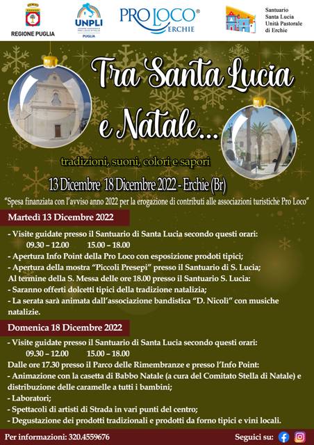 Prosegue la rassegna ideata dall’associazione turistica Pro Loco di Erchie da titolo “Tra Santa Lucia e Natale...tradizioni, suoni, colori e sapori”, un’iniziativa legata alla tradizione e cultura locale.