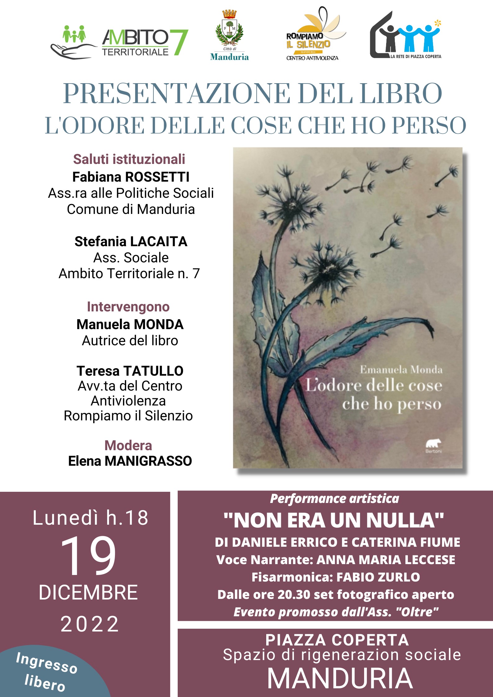Arriva a Manduria l’ultimo lavoro editoriale di Emanuela Monda: all’interno del cartellone di eventi “Natale di Comunità” promosso dalla Rete di piazza Coperta che animerà piazza Coperta – Spazio di rigenerazione sociale, il Centro Antiviolenza Rompiamo il Silenzio in collaborazione con l’Ambito Territoriale di Manduria, organizza, lunedì 19 dicembre, alle h. 18, la presentazione del libro “L’odore delle cose che ho perso”.