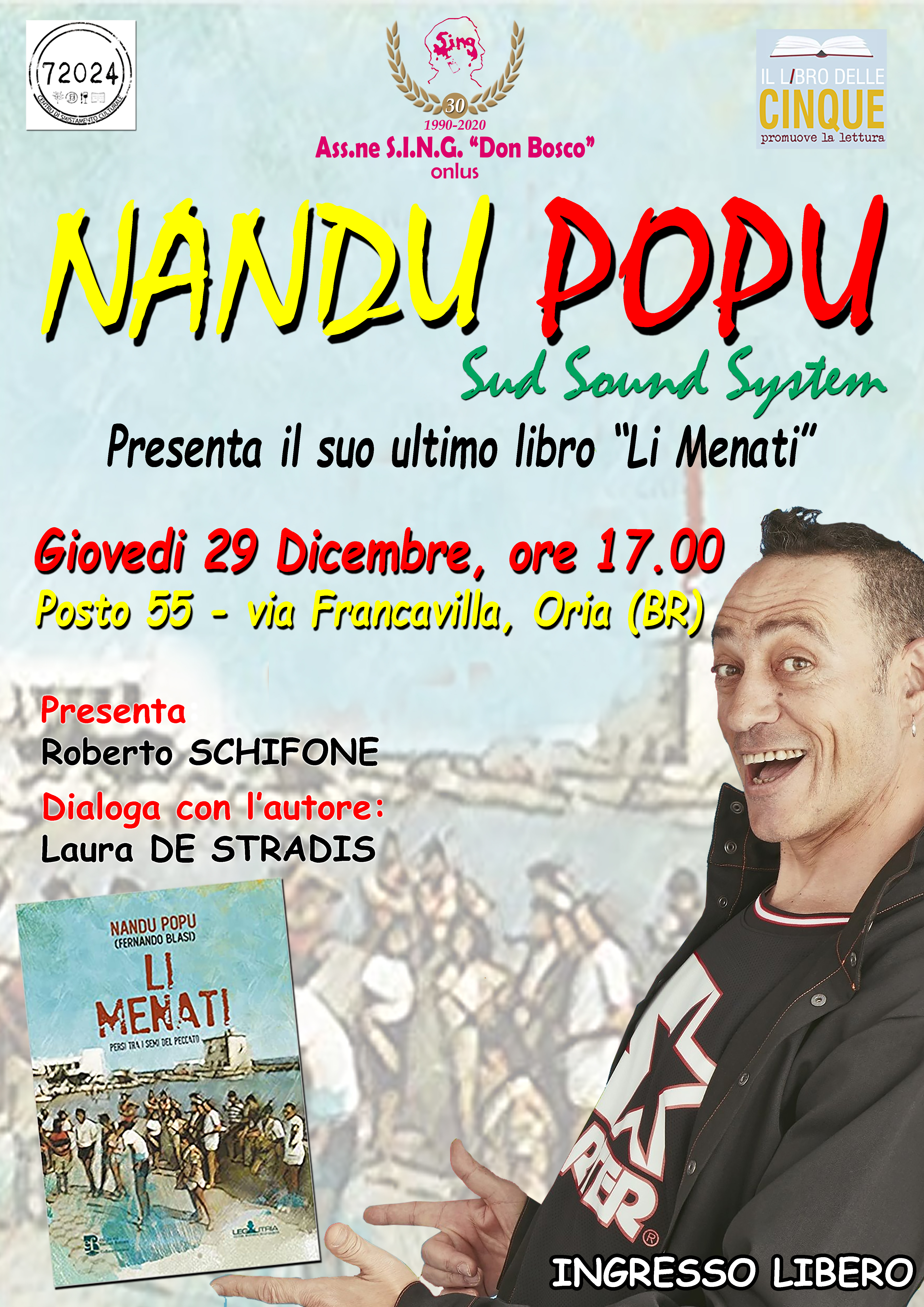 Fernando Blasi, in arte Nando Popu dei Sud Sound System, presenterà a Oria il suo secondo libro “Li menati, persi tra i semi del peccato” (Edizioni Radici Future), giovedì 29 dicembre, alle 17, a Posto 55.