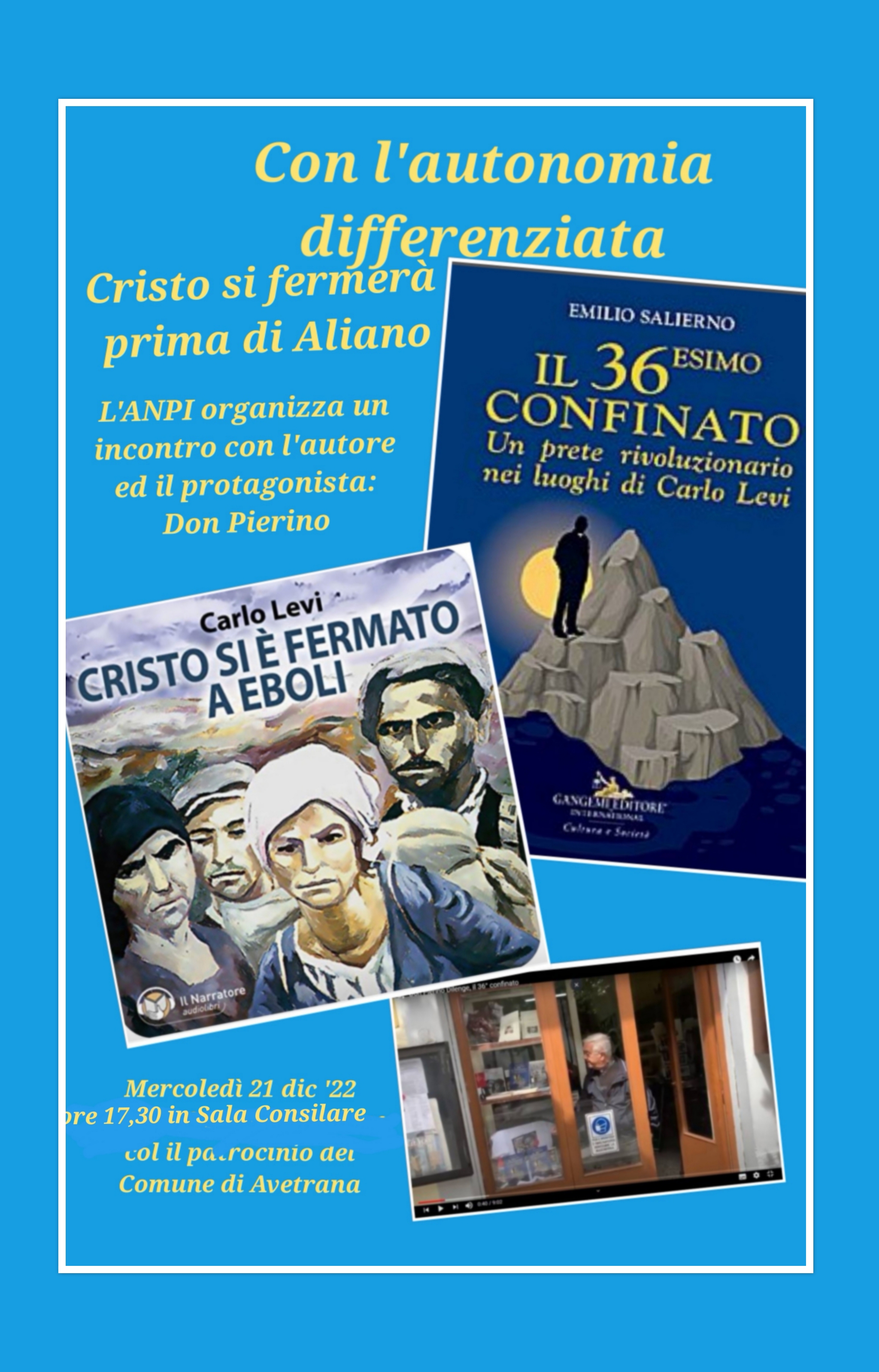 La sezione ANPI di Avetrana organizza, con il patrocinio del Comune, per domani (mercoledì 21 dicembre), alle17.30, nella sala comunale, la presentazione del libro “Il 36esimo confinato” (Gangemi Editore International). Seguirà il dibattito sul tema dell’autonomia differenziata delle Regioni, partendo proprio dall’esperienza visionaria del parroco di Aliano, in Basilicata, don Pierino Dilenge, protagonista del libro scritto da Emilio Salierno.