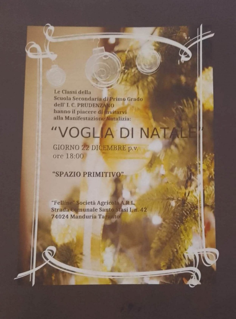 Giovedì 22 dicembre, alle ore 18, la location “Spazio Primitivo” (via Santo Stasi I, n° 42 - Manduria) farà da cornice a “Voglia di Natale”, la manifestazione natalizia che avrà come protagonisti gli studenti della nostra scuola secondaria di primo grado.