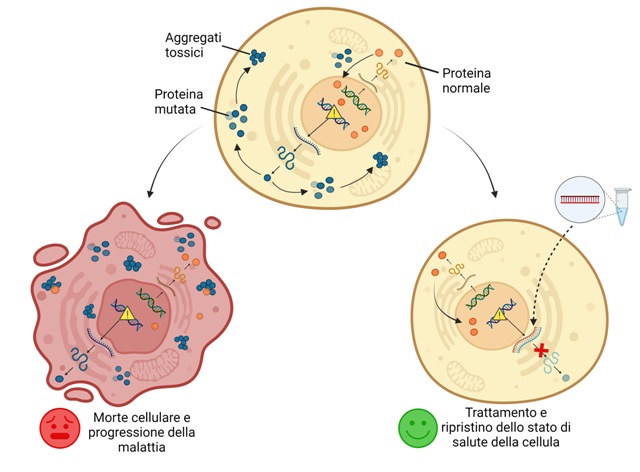 Spiega la professoressa Cecilia Bucci: «La tecnica che abbiamo utilizzato si basa sul concetto che un piccolo RNA, appaiandosi in una zona complementare a un RNA messaggero, formi un doppio filamento che blocca la produzione della proteina corrispondente, causandone una riduzione dell’abbondanza nella cellula. In questo caso abbiamo disegnato un piccolo RNA (chiamato siRNA) che causa la riduzione della proteina mutata, lasciando invece invariata la proteina normale che deve continuare a svolgere le sue funzioni all’interno delle cellule per consentirne la sopravvivenza».